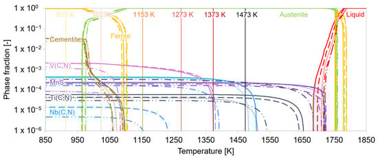 Equilibrium calculations based on the Calphad method [] were conducted to obtain the relevant temperature intervals where precipitation processes take place. The temperatures at which (Ti/Nb/V)(C,N) carbonitrides are present were identified via equilibrium calculations using the software MatCalc. In the stepped simulation, the phase fractions were calculated as a function of a specific temperature for a particular alloy composition. Figure 2 compares the equilibrium phase fractions of all five examined steel grades. The amount of precipitated carbonitrides clearly increased at lower temperatures.