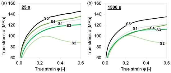 Stress–strain curves during single-hit compression tests with varying holding times before deformation and 0.01 s−1 strain rate at 1153 K for MA steel grades S1–S5. (a) 25 s; (b) 1500 s.