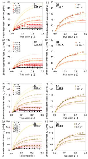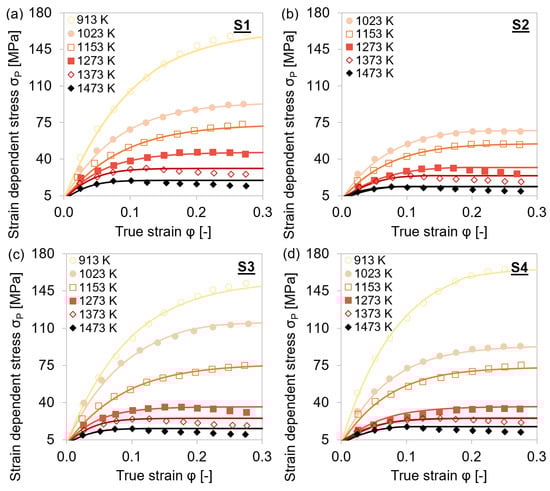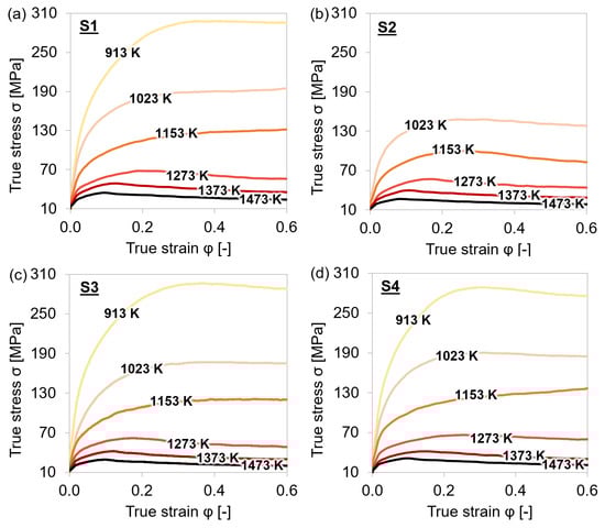 Figure 5 illustrates the temperature dependence of the stresses of the individual steel grades S1–S4. At elevated temperatures, softening of the material was observed at lower strains due to higher-grain boundary mobilities. The presence of peak stresses indicated that dynamic recrystallization had already started. The higher the temperature, the lower the true stress values, as recovery and recrystallization processes lead to a reduction of the dislocation density.