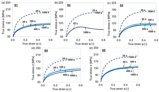 Figure 6 depicts the stress–strain curves for each material with varying holding times before deformation and at two different strain rates. With higher strain rates, there was less time available for recovery and recrystallization processes, and therefore the stress increased significantly with increasing strain rate. The true stress slightly decreased when the material was held longer at the deformation temperature before plastic deformation. The prolonged holding may lead to coarsening of (Ti,Nb,V)(C,N) and agglomeration of the former finely dispersed precipitates as well as static recrystallization. These effects are expected to be more pronounced at the steel grades with higher amounts of microalloying elements such as S4 and S5.
