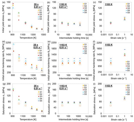 Physical parameters for single-hit compression tests with 25–1500 s holding times before deformation and 0.01–1 s−1 strain rates at 913–1473 K for MA steel grades S1–S5. (a–c) Initial yield stress σ0; (d–f) initial strain hardening rate θ0; (g–i) saturation stress σ∞.