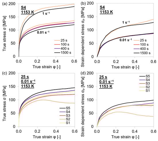 It was observed that temperature and strain rate affected all three parameters proportionally. The values of σ0, θ0, and σ∞ decreased monotonically with temperature and increase with the strain rate. As for lower θ0 at elevated temperatures (Figure 7d), it can be stated that it took more deformation to reach σ∞ than at lower temperatures. The high strain hardening rates at lower temperatures, on the other hand, led to a high stress increase with compression. As indicated in Section 4.1.2, the influence of the holding time before the deformation was only shown to have a slight effect on the yield stress. That σ0 was the only stress that was affected by different holding times can be assured in a direct comparison of the entire stress–strain curves (Figure 8a,c) and the flow curve of σP against the true strain (Figure 8b,d), where the yield stress σ0 was subtracted from the rest of the stress–strain curve. Figure 8a,b shows such plots for different holding times of the same material, while Figure 8c,d shows those for the same holding time of different materials.