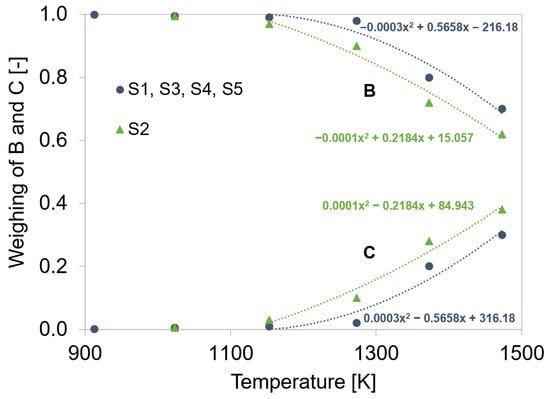 Temperature-dependent experimental weighing factor for parameters B and C.