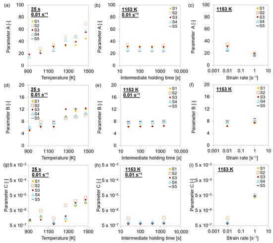 Strengthening parameters for single-hit compression tests with 25–1500 s holding times before deformation and 0.01–1 s−1 strain rates at 913–1473 K for MA steel grades S1–S5. (a–c) Parameter A; (d–f) parameter B; (g–i) parameter C.
