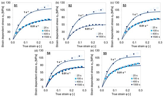 Stress–strain curves during single-hit compression tests with 25–1500 s holding times before deformation and 0.01 s−1 (continuous line) as well as 1 s−1 (dashed line) strain rates at 1153 K. (a–e) MA steel grades S1–S5.