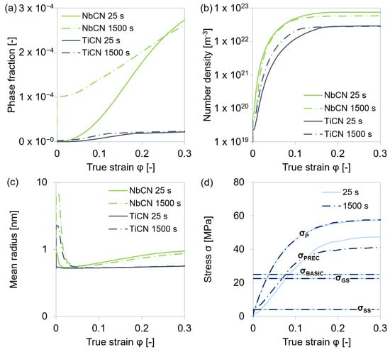 For the predictive strain hardening in combination with precipitation kinetics based on thermodynamic [] and diffusion mobility [] databases implemented in the mean-field microstructure modeling software package MatCalc [], sensible input parameters for the dislocation density evolution are required. For the determination of A, B, and C the experimentally determined σ0, σ∞, and θ0 and Equations (7)–(9) were employed for the implemented ABC-model within MatCalc. For the precipitation simulation, the nucleation sites of (Ti,Nb,V)(C,N) carbonitrides were selected as dislocations []. The regular solution critical temperature Tcrit of the examined particles (TiCN: 4000 °C, NbCN: 3100 °C, VCN: 2600 °C) was estimated from the miscibility gaps of the corresponding binary phase diagrams. Simulations of the present study were performed using the values in Table 2 and a strengthening coefficient α of 0.12. This factor depends on the dislocation pattern heterogeneity and decreases at high deformation [,]. For the calculated values of the critical annihilation distance between two dislocations dcrit and the diffusion coefficient Dd, Equations (10) and (11) were used, respectively. Activation energy for pipe diffusion in the austenite phase of Qd = 185∙103 [Jmol−1] and the pre-exponential factor of Dd0 = 4.5∙10−5 [m2s−1] was used for the calculation of the diffusion coefficient Dd [].
