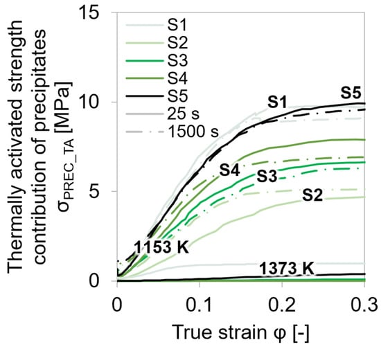 For the additional examination of the thermally activated stress contribution solely affected by precipitates (σPREC_TA), the limiting case for the mechanical threshold can be assumed. In this instance, the basic yield strength, the solid solution strength, and the grain boundary strength have to be excluded when calculating . This assumption is feasible, as the single strength contributions are generally summed up additively without interconnected correlations regarding the calculation of . Therefore, via the combination of Equations (14)–(16), thermally activated precipitation hardening is calculated: