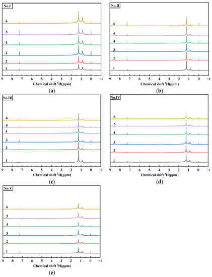 1H-NMR spectra of bitumen samples. (a) asphalt No. I; (b) asphalt No. II; (c) asphalt No. III; (d) asphalt No. IV; (e) asphalt No. V.