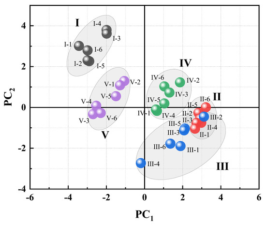 According to this, the total variance of the first two principal components PC1 and PC2 is 89.3%, which makes a great contribution to the model and reflects that many indicators in the original data are well reflected. PC1 and PC2 are respectively taken as the X and Y axis to obtain the PCA score chart (Figure 6). The distance between two points in the chart reflects the differences in chemical composition between the two samples. The farther apart the two samples, the greater the difference in the chemical composition between them. As shown in Figure 6, the distinction between asphalt samples from different oil sources is apparently obvious, and asphalt samples from the same oil source with different aging degrees still gather together and do not cross with asphalt samples from other oil sources. This shows that the aging does not change the “gene” framework of asphalt. Among them, asphalt No. IV whose oil is from China Bohai SZ-361 gathers in the first quadrant; asphalt No. I whose oil is from northwest China and asphalt No. V from the China Bohai region both gather in the second quadrant; and asphalts No. II and No. III whose oil is from the Middle East gather in the fourth quadrant.