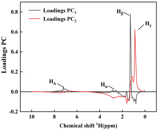 In order to further screen out the potential chemical structure markers that distinguish asphalt samples, the loading diagrams of the first two principal components of PCA were analyzed, and the hydrogen atoms belonging to areas related to sample clustering are pointed out in Figure 7. The chemical composition that contributes the most to the classification of different groups of samples is usually the substance that is far away from the center of the loading diagram, which shows that the farther away from the center, the greater the influence on the classification. It can be seen from the loading diagram that asphalt No. IV Hβ, HA in the first quadrant has a higher content, asphalts No. I and V in the second quadrant have higher contents of Hγ, and asphalts No. II and No. III in the fourth quadrant may have higher contents of Hα. The above results further show that the oil source of asphalt determines the chemical composition of asphalt. Although some chemical composition changes take place in the aging process of asphalt, they do not cause the fundamental changes in asphalt composition and structure. That is, the aging property of asphalt is determined by the original composition of asphalt, the oil source for producing asphalt.
