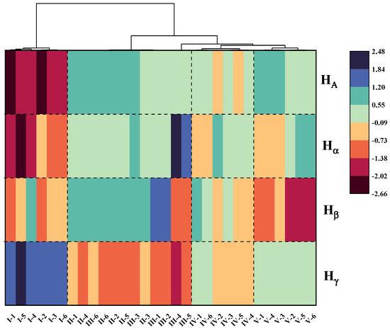 In order to quantitatively analyze the differences in chemical composition among asphalt samples from different oil sources, the four hydrogen atoms belonging to areas that have the greatest influence on the clustering of asphalt oil sources were selected for cluster analysis, and a cluster heat map was drawn (Figure 8). As shown in Figure 8, the oil sources of asphalt samples can be classified according to the four kinds of hydrogen atoms. Asphalt samples from the same oil source with different aging degrees can group into one category, and the contents of the four kinds of hydrogen atoms among asphalt samples with different oil sources are obviously different. Generally, the content order of Hγ is I > V > IV > II, III, Hβ is II, III > IV > I > V, Hα is II, III > IV, V > I, and HA is II, III, V > IV > I. The results of HAC are consistent with those of PCA, which further confirms that the oil source of asphalt determines the chemical composition and aging performance of asphalt.