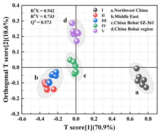 In order to further determine the differences between samples among various oil sources, OPLS-DA under the Pa scaling method was used to centralize and nondimensionalize the data [32]. Based on the principle of combining OSC with PLS, OPLS-DA with supervised pattern recognition removes the influencing factors unrelated to the classification information in the modeling process. Thus, some subtle differences among different asphalt samples can be obviously reflected, and better classification results can be obtained. As shown in Figure 9, compared with PCA, asphalt samples from different oil sources can be better separated in OPLS-DA. Through OPLS-DA, the 30 asphalt samples were divided into 4 categories according to oil source: asphalt No. I, whose oil source is northwest China, gathers in Area A; asphalts No. II and No. III, whose oil source is the Middle East, gather in Area B; asphalt No. IV, whose oil source is China Bohai SZ-361, gathers in Area C; and asphalt No. V, whose oil source is the China Bohai region, gathers in Area D. Evaluation parameters R2X (cum) and R2Y (cum) of the model, respectively, indicate the explanatory rate of the model to the X and Y matrices, and Q2 (cum) indicates the prediction ability of the model. In this model, Q2 is 0.573 > 0.5, which indicates that the model has good fit and prediction ability. In this model, the boundaries between the four types of asphalt samples are obvious and have no overlap, so the discrimination effect is good.