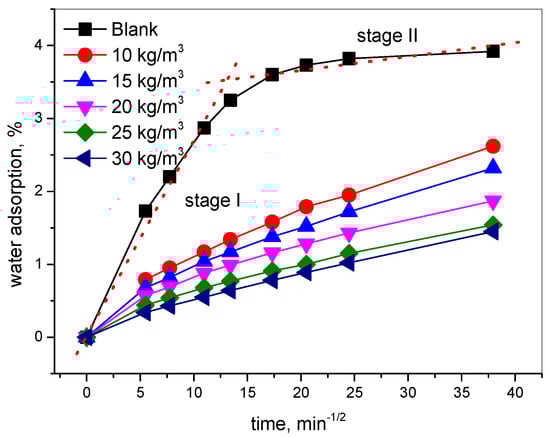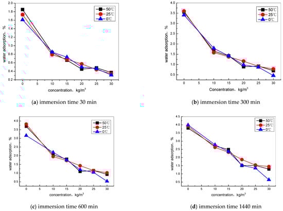 - The nano-hydrophobic admixture exhibits a significant water adsorption inhibition behavior; the higher the content of TIA incorporated into concrete, the more water transportation-restraint performance was obtained. During the water adsorption process, the main influencing factor is the structure of the concrete pore modified by TIA, while the temperature has less effect on water transportation.