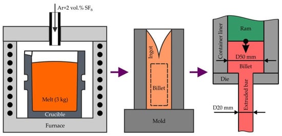 The scheme of extruded bars processing from casting to hot extrusion.