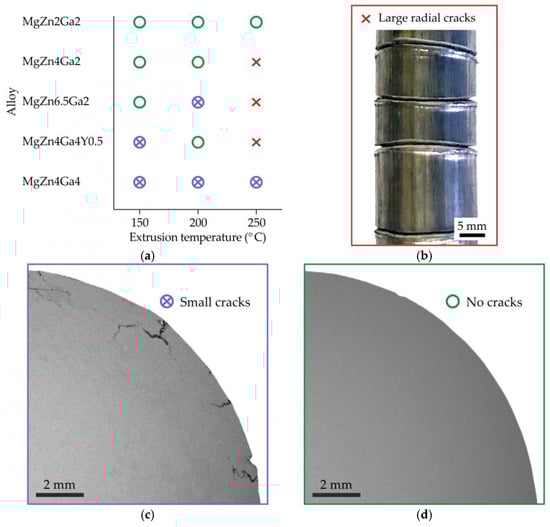 (a) Graph defining the quality of the Mg–Zn–Ga–(Y) alloy bars as a function of alloy composition and extrusion temperature. The quality examples are shown in: (b) bar with large radial cracks (e.g., MgZn4Ga2 alloy extruded at 250 °C), (c) bar with small (~1−2 mm) surface cracks (e.g., MgZn4Ga4 alloy extruded at 150 °C), and (d) bar without cracks (e.g., MgZn2Ga2 alloy extruded at 150 °C).