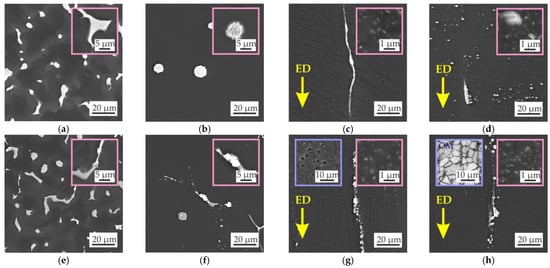The microstructures along the direction parallel to the ED of the Mg–Zn–Ga–(Y) alloys extruded at 150 and 200 °C are shown in Figure 3. The alloys extruded at 250 °C had similar microstructures (not shown here). In the extruded alloys, the intermetallic phases, which did not fully dissolve during HT, were elongated towards the ED and were significantly fragmented. MgZn2Ga2 and MgZn4Ga2, which had a single-phase microstructure after HT, were the alloys with no large intermetallic phases observed. The insets in Figure 3 (pink boxes) show the microstructures of the extruded alloys at high magnification. Small precipitates of secondary phases were formed during extrusion via a stress-induced precipitation mechanism in the α-Mg matrix.