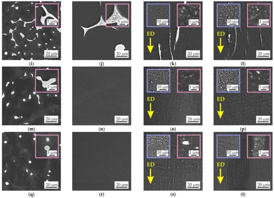Microstructure of the (a–d) MgZn4Ga4, (e–h) MgZn4Ga4Y0.5, (i–l) MgZn6.5Ga2, (m–p) MgZn4Ga2, and (q–t) MgZn2Ga2 alloys in the (a,e,i,m,q) as-cast condition, (b,f,j,n,r) after HT for 15 h at 300 °C + 30 h at 400 °C, and after hot extrusion at (c,g,k,o,s) 150 or (d,h,l,p,t) 200 °C. The insets with pink boxes show higher-magnification images, while those in blue boxes show the microstructure after etching (only for extruded alloys).