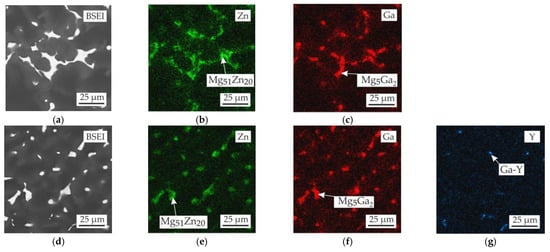 Microstructure and EDS maps of the (a–c) MgZn4Ga4 and (d–g) MgZn4Ga4Y0.5 alloys in the as-cast condition. The EDS maps showing the distribution of (b,e) Zn, (c,f) Ga, and (g) Y.