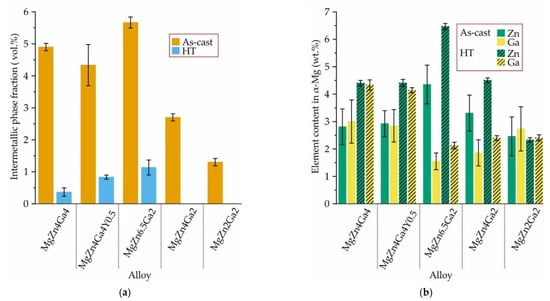 The alloy microstructures after HT are also shown in Figure 3. In comparison with as-cast microstructure, the dissolution of intermetallic phases and changes in their morphology to spherical structures were observed. The fractions of Mg12Zn13, Mg5Ga2, and Ga–Y intermetallic phases in Mg–Zn–Ga–(Y) alloys in the as-cast condition and after HT are present in Figure 5a. After HT, a residual intermetallic phase was observed for high-alloyed alloys (MgZn6.5Ga2, MgZn4Ga4, and MgZn4Ga4Y0.5). For low-alloyed MgZn4Ga2 and MgZn2Ga2 alloys, a single-phase α-Mg microstructure was observed. In the microstructure of the alloys after HT, Mg12Zn13, Mg5Ga2, and Ga–Y intermetallic phases are present. These phases act as cathodes for α-Mg during the corrosion process [33]. Therefore, high volume fractions of such phases in the alloy are undesirable from the corrosion standpoint. In opposite, the intermetallic phases can act as recrystallization centers according to the particle-simulated nucleation mechanism during subsequent deformation and lead to a decrease in grain size [43].