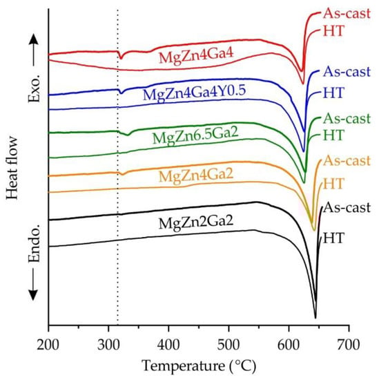 The DSC results for Mg–Zn–Ga–(Y) alloys in the as-cast and HT conditions are shown in Figure 6. The solidus temperature for all investigated alloys obtained from as-cast samples was 316 °C, which is associated with the ternary eutectic transition L→α-Mg + Mg51Zn20 + Mg5Ga2 [33]. This temperature is close to the ternary eutectic transition temperature of 299 °C obtained via FactSage calculation. In the post-HT alloys, the endothermic effect connected with the eutectic melting was not observed. During HT, the intermetallic phases formed due to eutectic transition dissolved, and the solidus temperature of the alloys increased. However, in the alloy microstructure produced under HT conditions (Figure 5a), complete intermetallic phase dissolution was observed for low-alloyed MgZn4Ga2 and MgZn2Ga2 alloys only. The high-alloyed alloys after HT still contained intermetallic phases in their microstructures. The absence of an endothermic peak at 316 °C in the DSC curve for these alloys after HT is associated with a low fraction of intermetallic phases in their microstructure leading to a low thermal effect of eutectic melting.