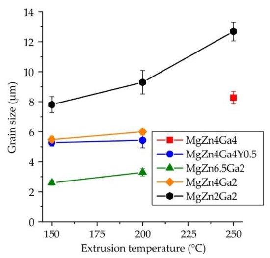 The insets in Figure 3 in the blue box show the microstructure of the alloys after etching. The grain structure was close to a fine DRX one, but a small fraction of coarse non-DRX grains was also observed. The average grain sizes of the Mg–Zn–Ga–(Y) alloys extruded at different temperatures are shown in Figure 8. The grain sizes of the MgZn4Ga4 alloys formed at extrusion temperatures of 150 or 200 °C were not measured because the samples could not be effectively etched due to high fraction of intermetallic phases in its structure. However, it can be concluded that the finer grains were observed at lower extrusion temperatures, and for the MgZn2Ga2 alloy, it is more clearly seen.