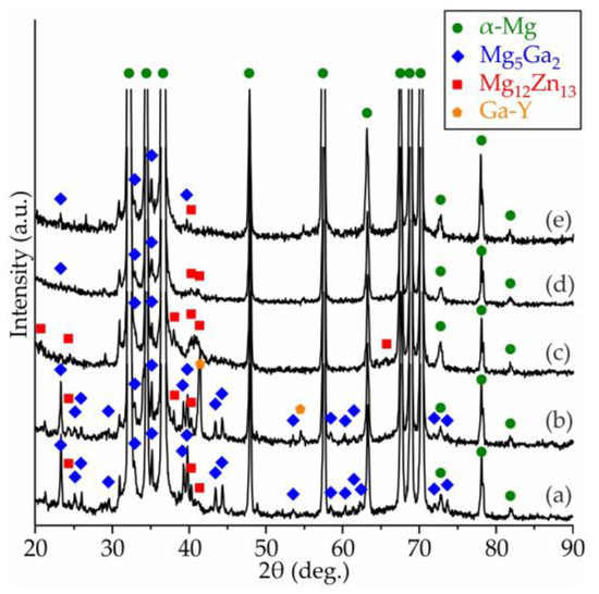XRD patterns of (a) MgZn4Ga4, (b) MgZn4Ga4Y0.5, (c) MgZn6.5Ga2, (d) MgZn4Ga2, (e) MgZn2Ga2 after hot extrusion at 150 °C.