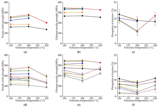 Typical engineering tensile stress–strain curves obtained for large standard cylindrical specimens of the Mg–Zn–Ga–(Y) alloys after hot extrusion at 150 or 200 °C are shown in Figure 10, while the corresponding tensile properties are shown in Figure 11a–c. From the tensile stress–strain curves, the slope of the elastic region was the same for all investigated alloys.