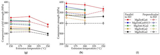 Mechanical properties as a function of the extrusion temperature of the Mg–Zn–Ga–(Y) alloys evaluated using (a–c) large standard cylindrical tensile-test specimens, (d–f) small flat-plate tensile-test specimens, or (g,h) small compression-test specimens cut along the directions parallel and perpendicular to the ED. (a,d) TYS; (b,e) UTS; (c,f) El; (g) CYS; and (h) CS; (i) legend.