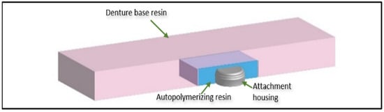 Thirty specimens (65.0 × 10.2 × 5.1 ± 0.2 mm3; n = 10/material) mimicking overdentures with a central hole (10.0 × 6.0 × 3.5 mm3) were fabricated. The 3D-printed denture base specimens were designed using a CAD program software AutoCAD (Autodesk Inc.; San Francisco, CA, USA) and exported as a standard tessellation language (STL) file. A digital light processing (DLP) 3D printer (Asiga MAX™; Asiga, Sydney, Australia) was used to print the specimens with a layer thickness of 50 μm in a vertical orientation on the printing platform and identical supports were generated for all the specimens. The post-processing of the printed specimens was done according to the manufacturer’s guidelines by cleaning them in isopropanol (>98%) for two minutes inside an ultrasonic path (Form Wash; Formlabs, Berlin, Germany) to dissolve any unpolymerized resin and then rinsing in a clean alcohol solution for an additional three minutes. The specimens were allowed to dry in the air and then post-cured in a polymerization unit at 60 °C for 30 min (Form cure; Formlabs, Berlin, Germany). All supports were then removed. In order to fabricate the conventional and high-impact resin specimens, custom Teflon molds were made by using additional 3D-printed specimens as a template. The materials were mixed, packed into the molds, and finally polymerized according to the manufacturer’s instructions as described in Table 1. Successive polishing of the specimens was carried out with a rotary polishing device (LabPol-21; Struers, Ballerup, Denmark) using 800- and 1200-grit FEPA abrasive papers (Buehler, New York, NY, USA). In this study, Novaloc titanium matrix housings (Valoc, Möhlin, Switzerland) (5.5 mm in diameter and 2.3 mm in height) with white (light) retention inserts were used. Specimens’ holes were first coated with a monomer liquid, then filled with an autopolymerizing PMMA resin mixture (Palapress; Kulzer GmbH, Hanau, Germany) before being slipped over the matrix housings to insert them into the specimen. After that, specimens were processed in distilled water at 55 °C and under air pressure of 300 kPa for 15 min in a pneumatic polymerizing unit (Ivomat IP3; Ivoclar Vivadent AG, Schaan, Liechtenstein) to polymerize the pickup material (Figure 1). The specimens were stored in dark containers filled with distilled water at 37 °C for 30 days before testing.