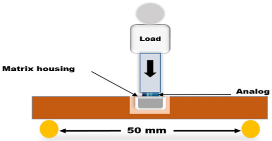 Indicative flexural strength (FS) and elastic modulus (EM) of the specimens were determined by a 3-point bending test carried out using a universal testing machine (Lloyd model LRX; Lloyd Instruments, Bognor Regis, UK). The distance between the test supports was set at 50 mm, while the load was applied at a crosshead speed of 5 mm/min using an analog [31] (Novaloc Model Analog; Valoc, Möhlin, Switzerland) for load application (Figure 2). The load-deflection curves were recorded using analysis software (Nexygen 4.0; Lloyd Instruments). FS and EM were automatically calculated by the machine software using Formulas (1) and (2) [30]: