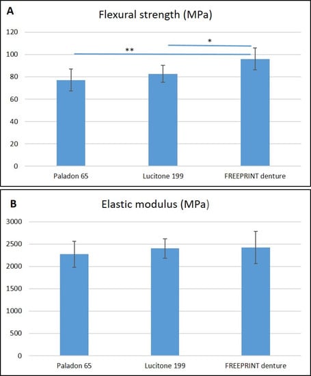 Mean values of (A), Flexural strength and (B), Elastic modulus of evaluated overdenture base materials. * and ** indicate a statistically significant difference by Tukey HSD (p < 0.05). Error bars represent standard deviation (SD).