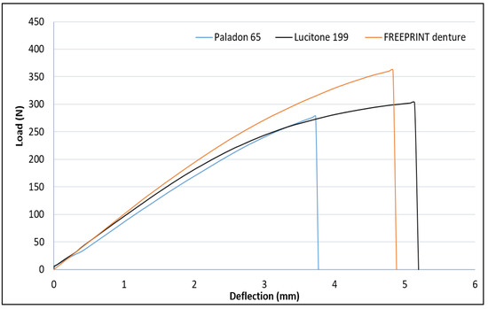 The flexural strength of the FREEPRINT denture (95.99 ± 9.87 MPa) was significantly higher than Paladon 65 (77.18 ± 9.69 MPa; p < 0.001) and Lucitone 199 (82.74 ± 7.73 MPa; p = 0.002). The flexural strength difference between Paladon 65 and Lucitone 199 denture base materials was not significant (p = 0.164). Figure 4 depicts the load-deflection curves of the tested materials, which highlighted the wider plastic deformation of the high-impact and the 3D-printed resins when compared to the conventional heat-cured PMMA. Paladon 65 and Lucitone 199 specimens displayed fracture in the middle above the attachment matrix, while FREEPRINT denture specimens displayed fracture in multiple sites in addition to the middle one (Figure 5).