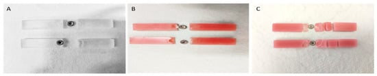 Fractured specimens of evaluated overdenture base materials. (A), Paladon 65; (B), Lucitone 199; (C), FREEPRINT denture.