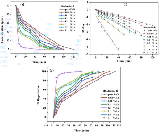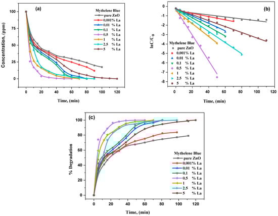 - Suwanboona, S.; Amornpitoksuk, P.; Sukolrat, A.; Muensit, N. Optical and photocatalytic properties of La-doped ZnO nanoparticles prepared via precipitation and mechanical milling method. Ceram. Int. 2013, 39, 2811–2819. [Google Scholar] [CrossRef]