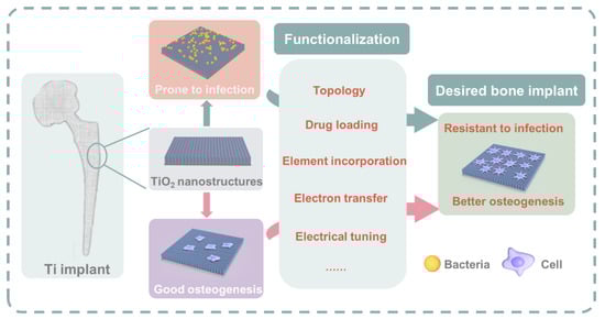 In this review, we will discuss the various functionalization approaches of TiO2 to improve the performance of the Ti implant. The schematic diagram of this review is illustrated in Figure 1. The functionalization aims to endow the implant with antibacterial properties and enhance its ability to support osteogenesis. Apart from the well-established approaches such as topology, drug loading, and element incorporation, this review also discusses the most newly developed electron transfer and electrical tuning approaches. TiO2 is a material extensively involved in the electronic and photocatalytic fields for its ability to conduct electron separation and transfer. In recent years, it has been discovered that electron transfer between TiO2 and biological cells can also occur, and electrical tuning of TiO2 for the antibacterial properties is becoming possible. These novel approaches are worthy of more attention and research devotion.