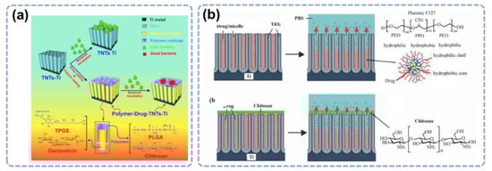 The release control can also be improved by biodegradable layers (Figure 4a) [59]. Nanotubes can be coated with different layers of PLGA or CHI to improve drug release control and osteoblast adhesion [60,61]. Aw et al. enabled the release control of water-insoluble drugs by integrating TiO2 nanotubes with Pluronic F127 polymeric micelles and biopolymer chitosan coatings (Figure 4b). They reduced the drug release burst from 77% to 39% and extended the overall release from 9 days to more than 28 days [60]. These results suggest the great potential of a nanotube-based antibacterial system for sustained drug delivery to combat chronic infection and inflammation after surgery.