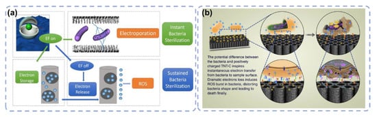 Based on the electron transfer mechanism of the above studies, researchers have further developed an innovative method to make the TiO2 surface obtain antibacterial properties through electrical tuning. In the beginning, it was found that an alternating current (AC) of about ±2 μA applied to the ZnO nanowires in a physiological solution could significantly improve the antibacterial property of ZnO after the current was removed (Figure 7a). The “sustained bacteria sterilization” was different from the “instant bacteria sterilization” because the latter was due to electroporation when AC was applied to the nanowires, but the former was due to surface functionalization by the electrical tuning [98]. After that, a 2 V low-voltage direct current (DC) power supply was used to conduct electrical treatment on the Ti plate with a TiO2 layer in the culture medium for 20 min. This DC tuning also changed the TiO2 surface from non-antibacterial to highly antibacterial [99]. After the electric tuning, TiO2 gained a strong ability to kill various bacteria and showed strong inhibition of biofilm formation. Meanwhile, the DC-tuned TiO2 surface had no negative effect on the osteoblast. The adhesion and proliferation of the cells were found to be as effective as those on the control TiO2 surface (Figure 7b).