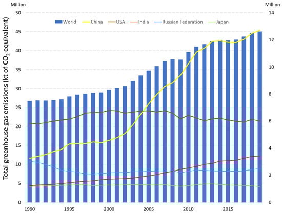 Representation of the total greenhouse gas emissions in the world, China, USA, India, Russian Federation, and Japan. Bar chart shows the emissions worldwide, line graphs show the emissions in China, USA, India, Russian Federation, and Japan with appropriate values on the left and on the right, respectively (based on online databases in World Bank Data [8]).