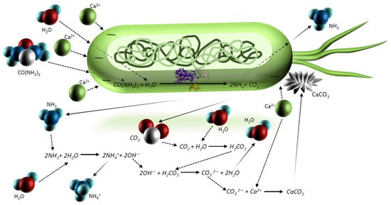 In the presence of urea, , in solution, bacteria start producing carbon dioxide () and ammonia (), as a by-product (Equation (1)). At the same time, ammonium ions (), hydrogen ions (), and carboxylic acid () are produced by the dissolution of ammonia () and carbon dioxide () in water, respectively, which leads to an increase in the pH of the environment (Equations (2) and (3)). Under alkaline conditions, carboxylic acid () reacts with hydroxide ions () to form carbonate ions () (Equation (4)), which consequently react with calcium cations () and precipitate calcium carbonate () (Equation (5)).