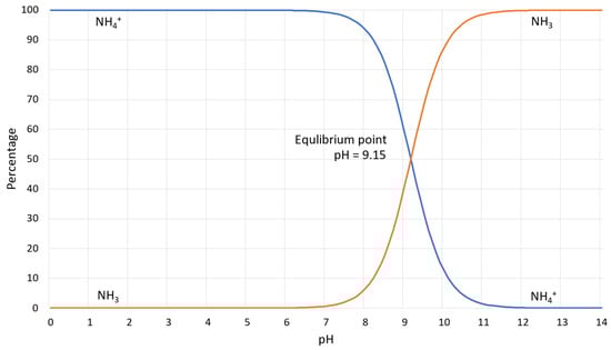 Figure 3. Dependence of percentages of free ammonia () and ionized ammonia (ammonium ()), abundance, and pH at T = 25 °C [33]. - -