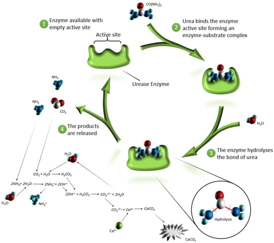 Urease contains nickel ions, which are essential for the hydrolysis of urea. These metal ions on the active sites of urease catalyze the reaction. During calcite deposition, urease undergoes many hydrolysis cycles until the nickel source is completely consumed [43]. In contrast to the bacterium, which loses access to oxygen and dies as a result of being enclosed by calcite, the urease has no such disadvantage [44].