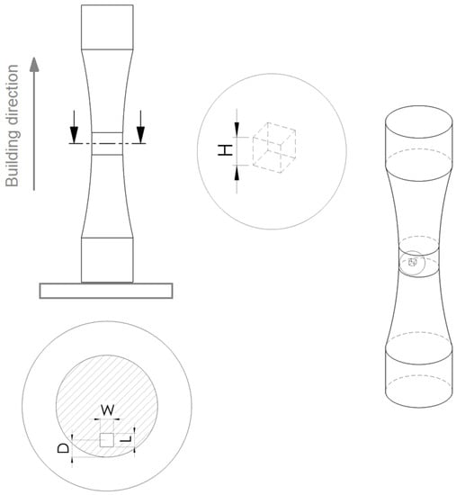 To investigate the influence of internal defects on the fatigue behavior of the two materials, artificial cubic defects were created in the specimens by selective non-melted areas (the internal defects were obtained by leaving a void in the CAD file, as shown in Figure 1). In particular, different defect configurations were investigated. The defect location relative to the closest outer surface was chosen according to an empirical rule introduced by Murakami [15]. According to the author, a defect may be considered internal if the following equation is verified: