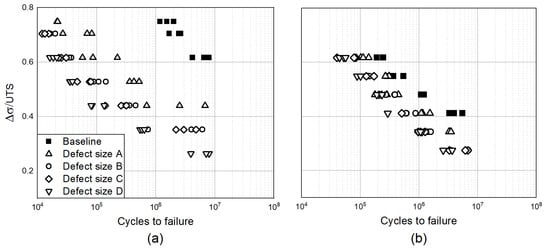 For both materials, the SN data points provided illustrate that the expected effect of the defect size was reproduced; larger defects result in decreased fatigue life. A clear and corresponding defect size influence on the lifetime is shown at all stress levels. This confirms the behavioral validity of the artificially induced defects obtained for each scenario.