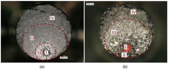 Four zones can be identified: (I) the crack initiation site where the artificial defect is clearly visible, (II) a bright circular area around the crack initiation site, (III) the main area where the stable crack propagation phase took place, and (IV) an area which indicates the final ductile fracture. The bright fish-eye circular zone is typically observed around internal crack initiation sites and serves as an indicator of the internal crack propagation [15]. As identified by Fomin [16], the fish-eye radius is equal to the distance from the internal defect to the surface. The smooth fracture surface causes a higher light reflection and the consequent bright appearance of the area. The explanation, as it will be discussed later in the paper, can be traced back to the absence of atmospheric effect within the first part of the defect propagation and its influence as soon as the defect becomes exposed to the external surface. The same observation can be deduced for Inconel coupons (see Figure 4b), where the environmental effect seems also to have an effect in the propagation area close to the defect, but it is less pronounced that in the Ti samples.