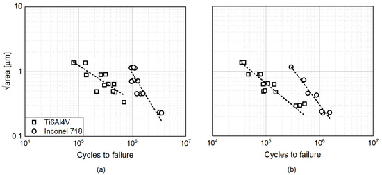 As can be seen in Figure 8, the slope of the fitting curve is consistent for the two different stress levels (≈0.58 for Ti64 and ≈1.07 for Inconel 718). This shows reproducible results in terms of the defects’ impact on the fatigue performance for the different scenario. In particular, the slope identified in the Titanium results is roughly double that of the Inconel one. The higher slope of the latter shows a lower sensitivity of the material toward defect; the fatigue life decreases slowly if the defect size increases.