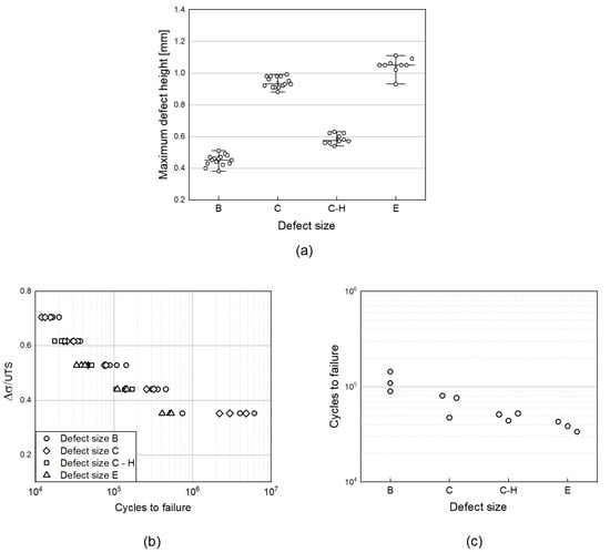 The defect height for every scenario was computed by -Computed Tomography inspection. Data analysis and evaluation was performed with the help of the software VG Studio Max (Volume Graphics GmbH). The maximum defect height recorded for each sample is reported as a function of the defect size in Figure 9a. A comparison with the defect scenario analyzed in the previous sections is highlighted. The corresponding fatigue results with a focus on the effect of defect height are reported in Figure 9b,c. In particular, the latter shows the cycles to failure of the different configurations for a given stress level (the same results may be obtained if the other stress levels are used). As identified in Figure 9a, the artificial defects in Defect size C and C-H have similar dimensions perpendicular to the loading direction but different defect heights. The defect height in scenario C-H is close to that in scenario B. On the other side, for scenario E, a bigger defect area perpendicular to the loading direction is expected compared to scenario C, but a similar defect height was measured.