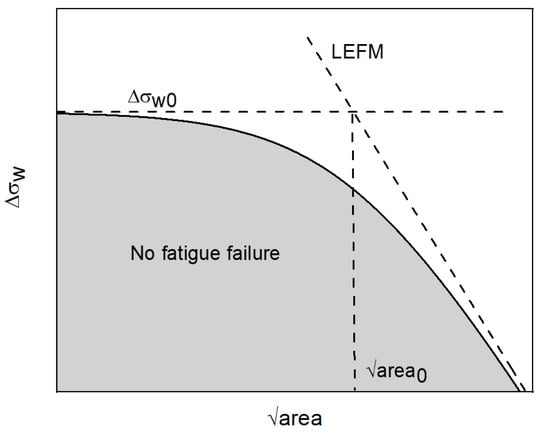 Defects may be analyzed in terms of stress raisers or according to Murakami treated as short cracks. To show the similarity between defects and small cracks for the fatigue limit assessment, different models were developed (Murakami [18], Chapetti [19], El-Haddad [20]). These models may be used to describe the different parts of the Kitagawa–Takahashi diagram [21], one of the most effective tools to obtain, for given cracks length or defect area, the allowable stress range for infinite life (see Figure 10).