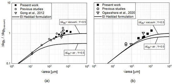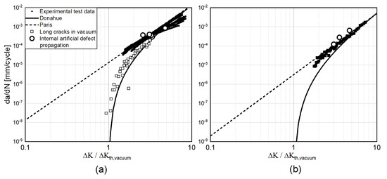 Contrary to Ti6Al4V, only a few studies regarding the propagation threshold in vacuum were conducted for Inconel. Nevertheless, if from one side, in Ti6Al4V samples, a remarkable slow propagation rate and a higher is evident [27,30], on the other side, as suggested by [31,32], the threshold values in air compared to the one in vacuum seem closer for Inconel 718. This result is partially confirmed by the fact that the value identified by the El-Haddad approach (see Figure 11b ) is consistent with the results obtained by FCG test in air from Yadollahi [10].