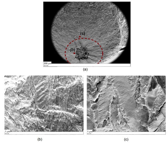 To verify the different defect propagation in Ti6Al4V, SEM analysis was conducted on one of the artificial defect configurations (see Figure 13a). Figure 13b shows a region close to the defect in the propagation Stage II (the bright circular area identified in Figure 4). The fracture surface may be led back to the one observed in vacuum propagation with more round edges and with granular features, as also highlighted by Yoshinaka [23]. On the other hand, a smoother appearance can be observed in Figure 13c, where a region in Stage III is shown. The fracture propagation that is supposed to happen in air during this stage shows a clear striation patterns which was not identified in Stage II. This confirms the fact that a different propagation took place. The same result was obtained in [23] where no striations were formed in vacuum.