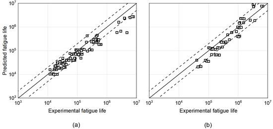 The experimental results presented in Section 3 are used to validate the model. The defects’ dimensions were characterized by the fractographic analysis performed, and their size was used as the initial flaw for the prediction model. Figure 16 shows the fatigue life correlation between the estimated fatigue lives and experimental results for all the different defect scenarios for both materials. The black line provides the perfect fit between the two results, while the dotted lines represent the scatter bands of a factor of two. According to several authors [38,39], a method works sufficiently well if the predicted points lies within this range.